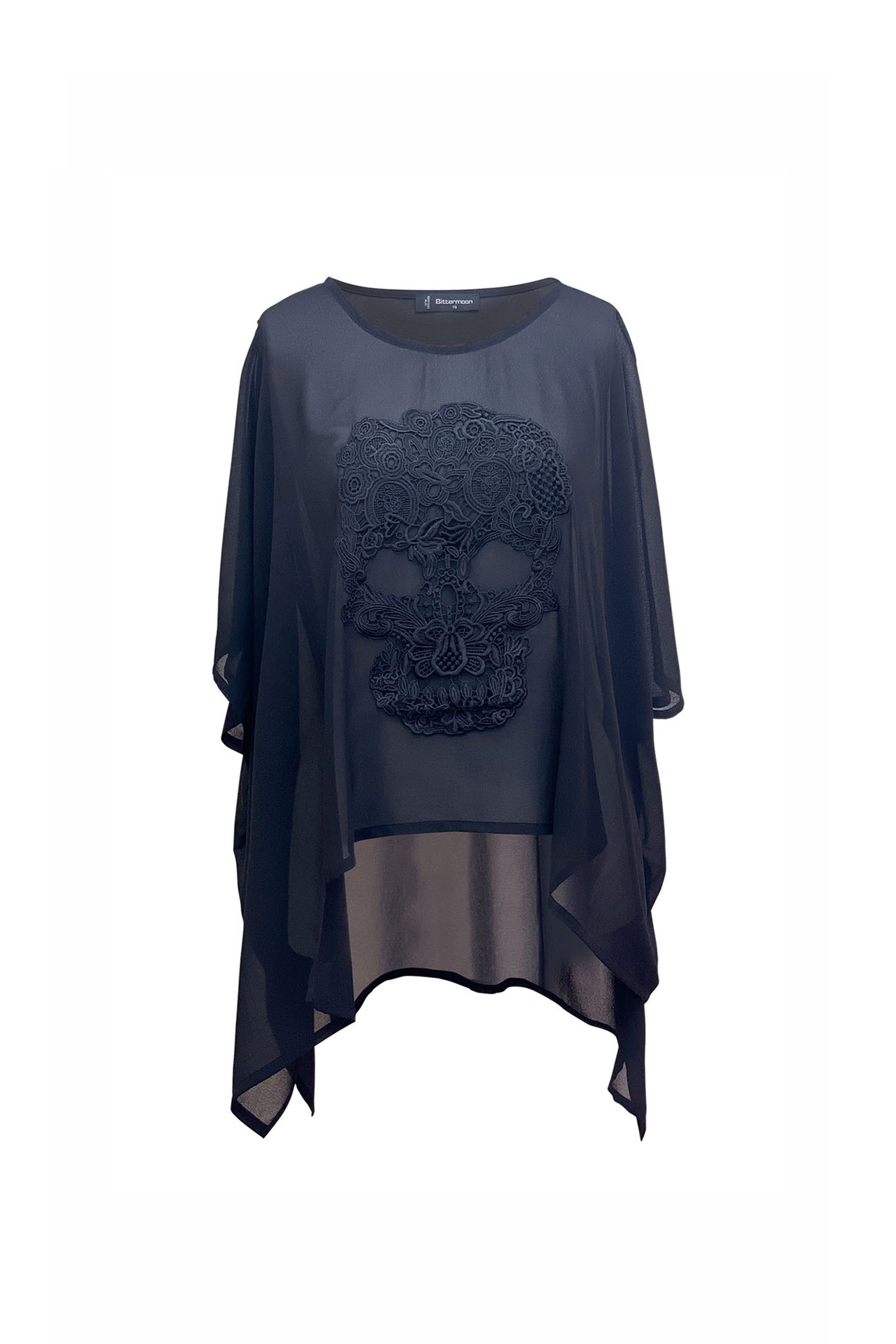 The Lacey Top brings a little drama. Crafted from a soft sheer georgette with an intricately embroidered skull motif, this floaty silhouette is an easy statement piece. Designed to layer effortlessly over a cami or slip, it’s bold, feminine and unapologetically Bittermoon.