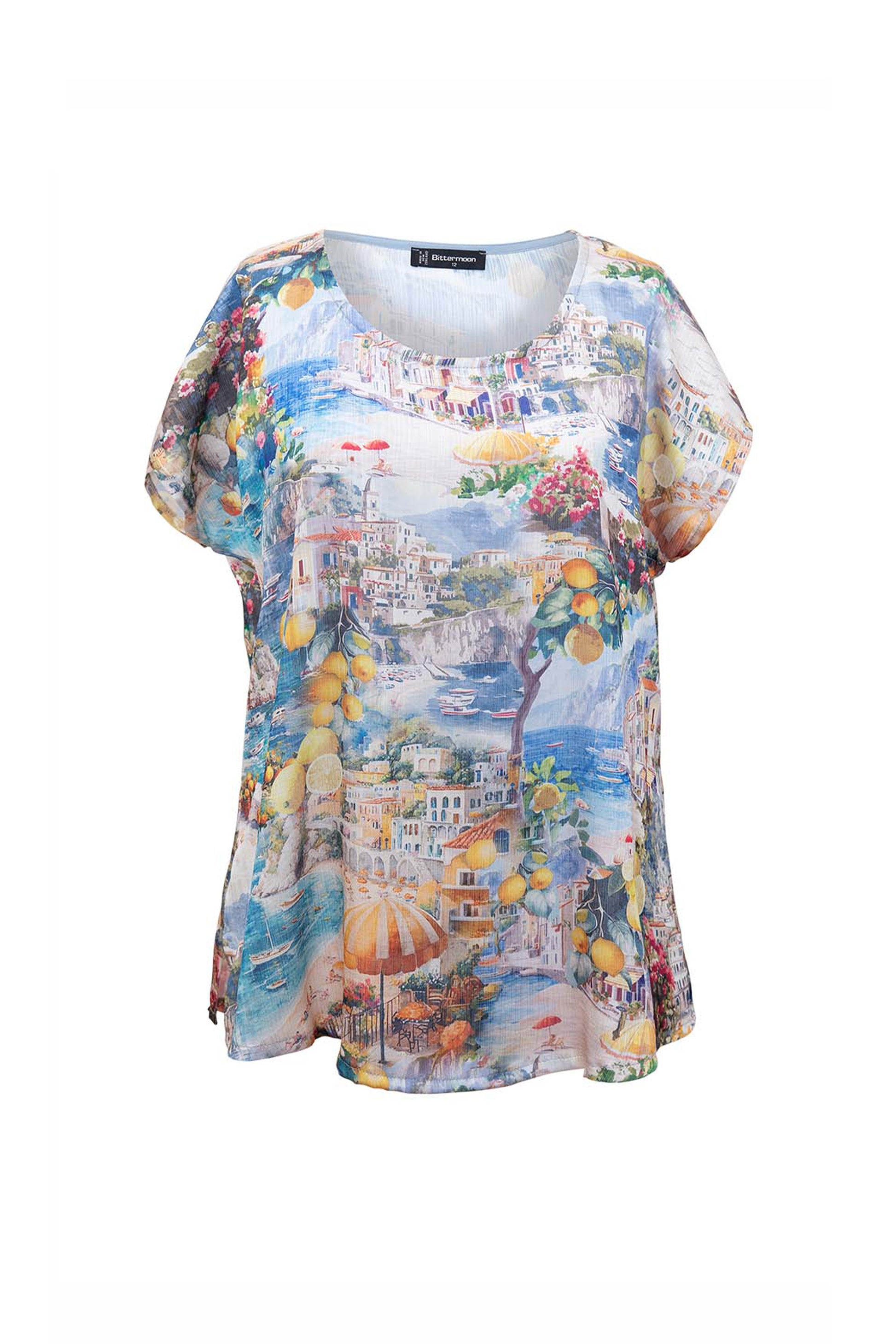 The Riviera Top is all sunshine and ease. With its painterly coastal print and soft crinkle texture, this breezy shape offers a gentle drape through the body and a classic scoop neckline. Pair with linen pants or denim for an effortless summer look.