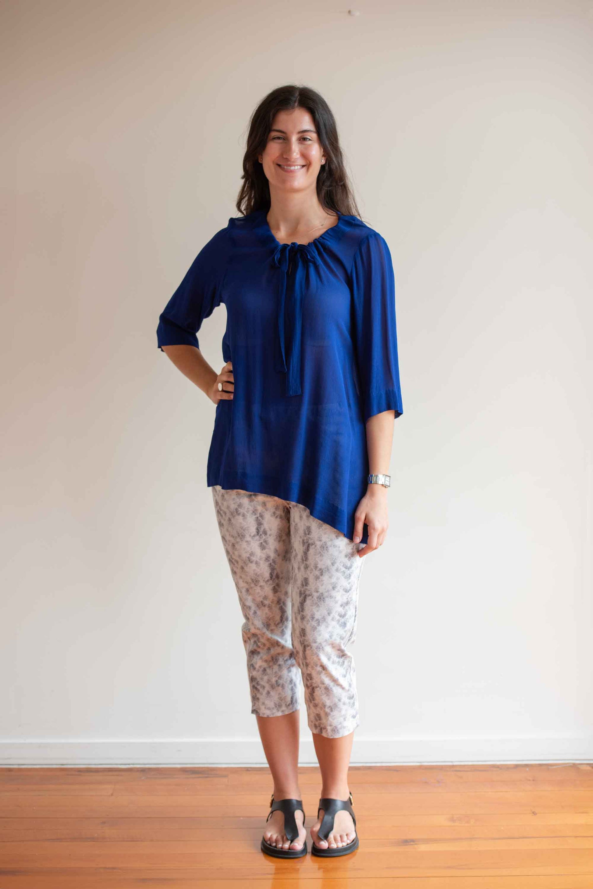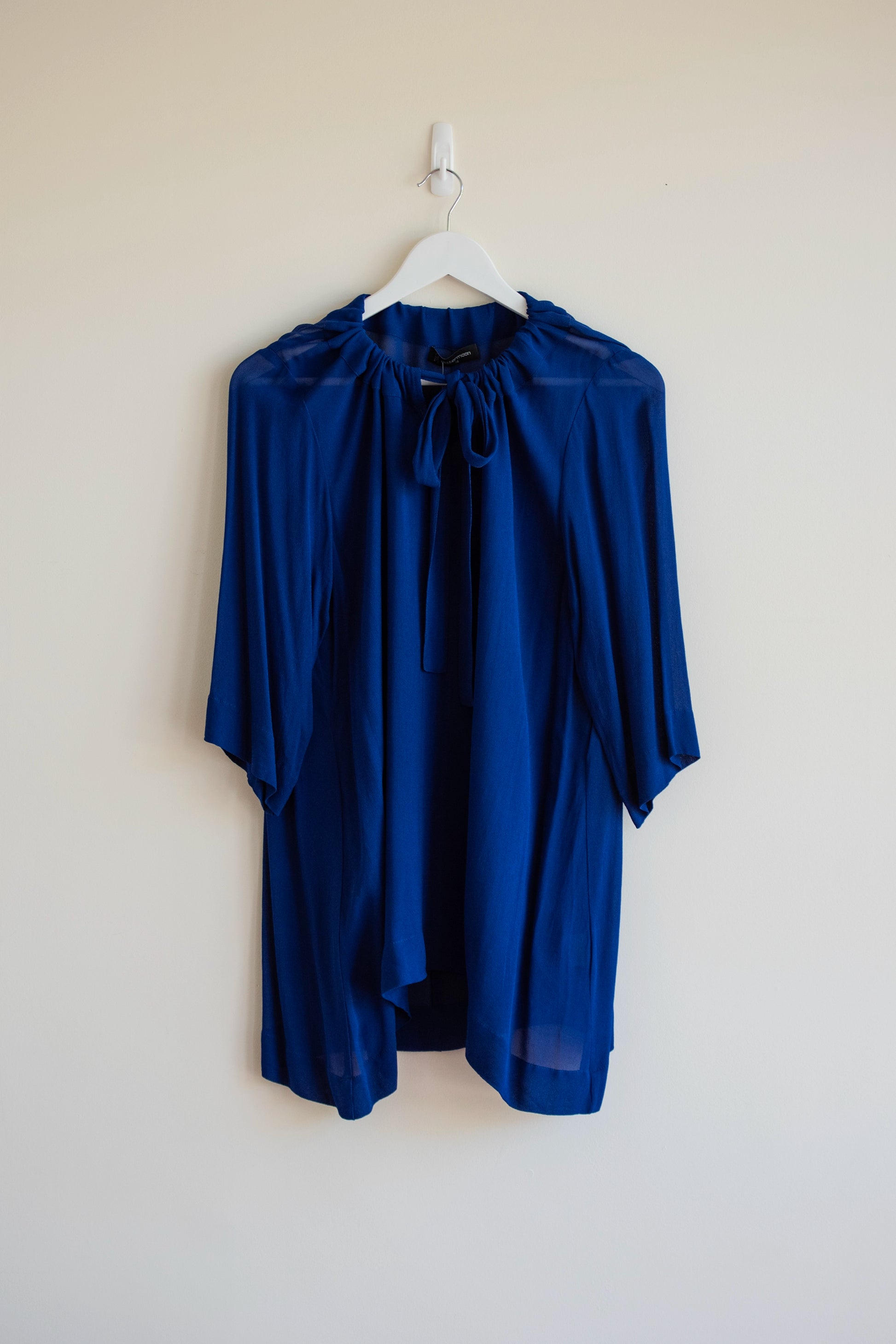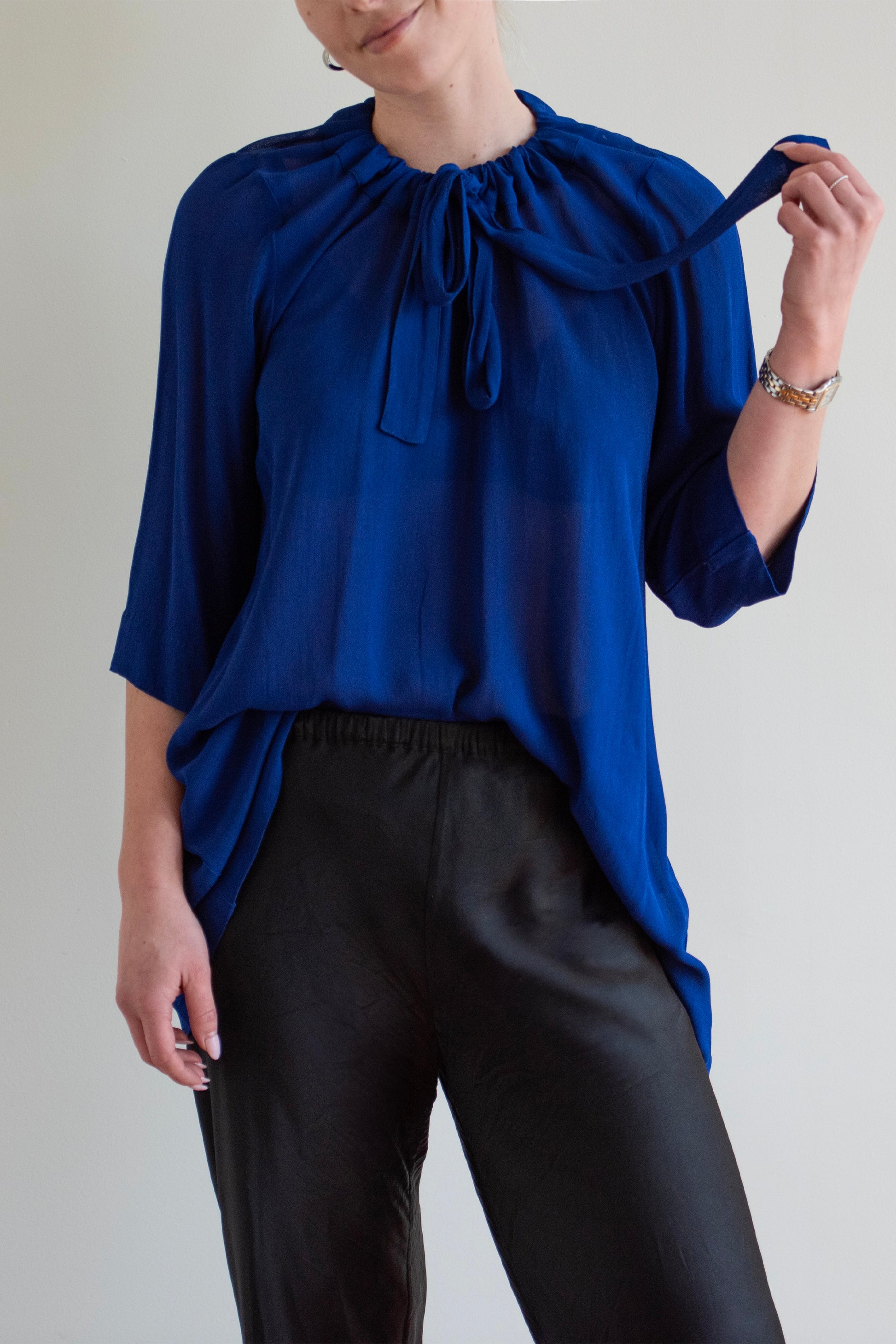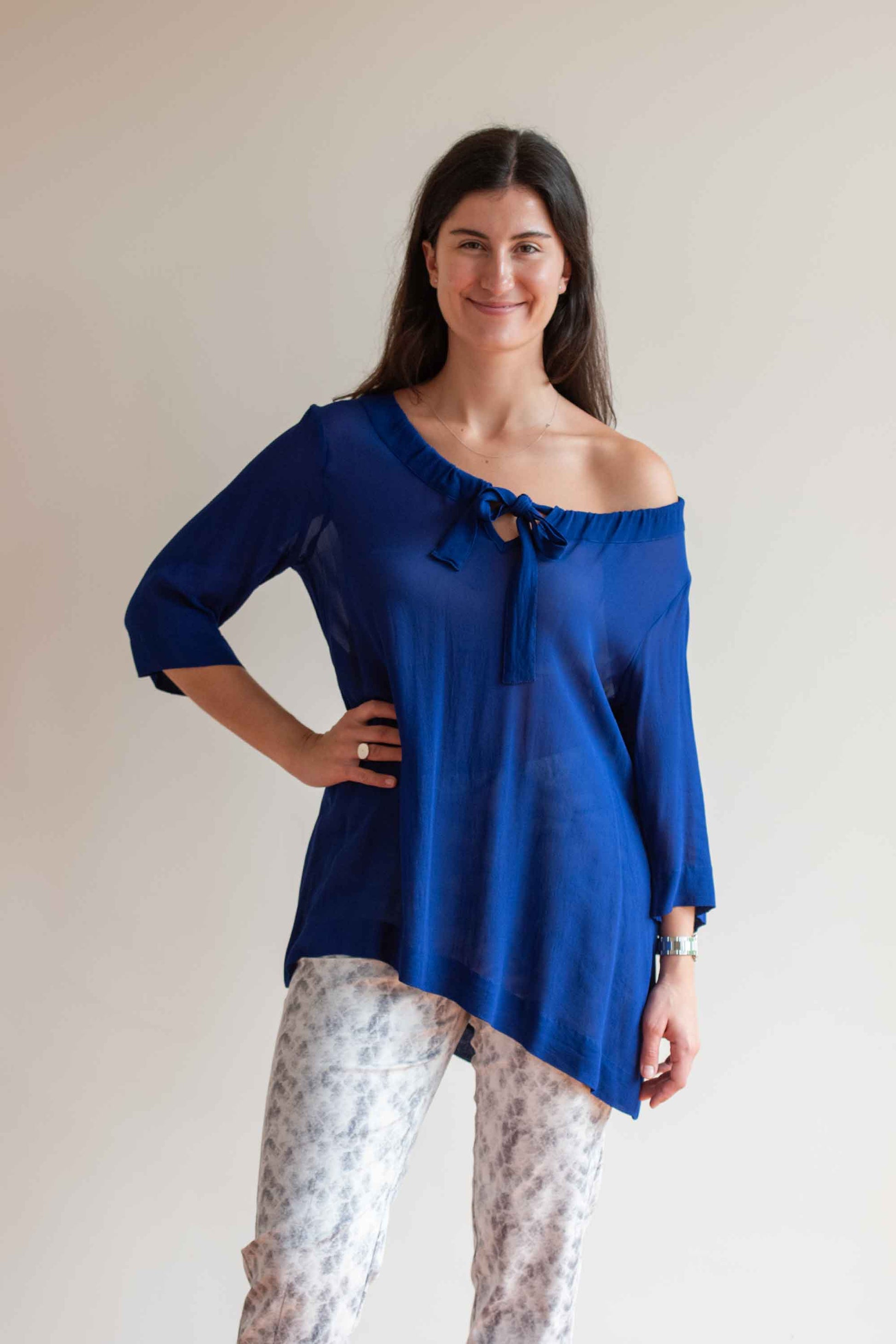 The Valencia Top offers endless styling possibilities. Made from semi-sheer viscose in Electric Blue, this fit-and-flare design features a drawstring neckline that can be styled on or off the shoulder.